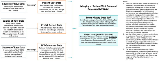 The original data sources provided by each center included any combination of electronic medical record (EMR) systems, appointment data, other third-party software, the Univfy report database, and SART CORS, the US national registry database managed by the Society for Assisted Reproductive Technology (SART) [42]. Figure 1 summarizes the sources of raw data, data processing steps, and the processed and merged data for analysis in addition to additional details. Of the seven centers, one was a Canadian center, and six were American centers that reported to SART.