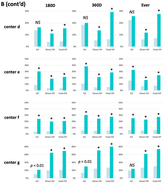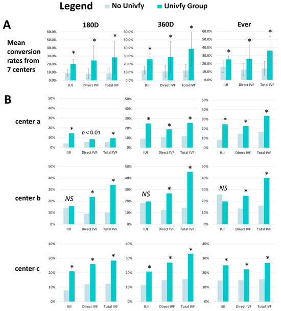 Comparison of IUI, Direct IVF, and Total IVF conversion rates between Univfy Group and No Univfy Group in 3 timed analyses. (A) The conversion rates across 7 centers were compared between Univfy Group and No Univfy Group for IUI, Direct IVF, and Total IVF conversions in each timed analyses, 180D, 360D, and Ever, using Wilcoxon signed-rank test. * p < 0.05. (B) The per-center IUI, Direct IVF, and Total IVF conversion rates are compared using chi-square tests * p < 0.001, NS not significant.