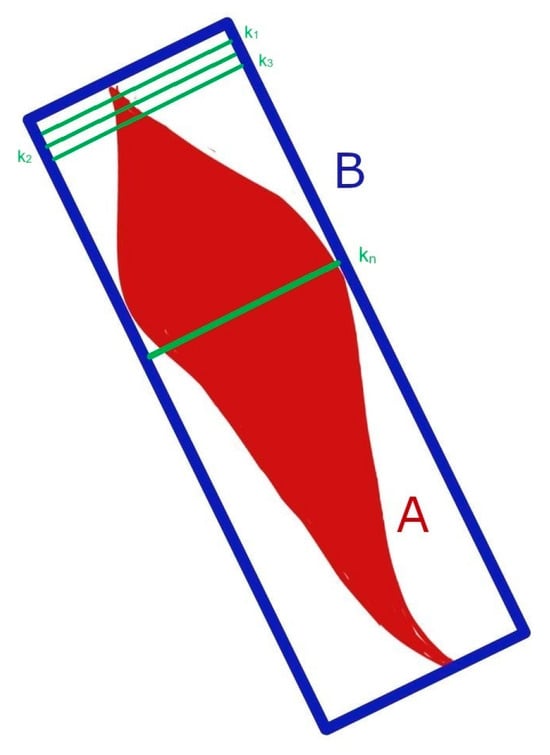 n with a width of n pixels and a length equal to the width of the wound area B, starting with n = 1. If the wound area within this small rectangle (A∩k