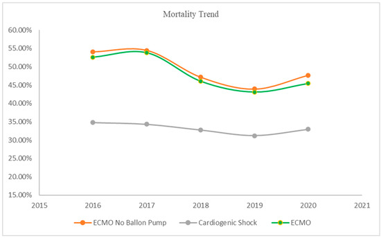 Various studies have reported different mortality rates of ECMO in patients with cardiogenic shock. Overall, the results have been virtually heterogeneous, and the in-hospital mortality rate ranged from 40% to 60% [22,23,24,25,26,27]. Recent clinical trials comparing the efficacy of VA-ECMO and optimal medical treatment demonstrated that using ECMO in patients with cardiogenic shock did not improve early and long-term mortality [28,29]. Additionally, a recent meta-analysis comparing the efficacy of ECMO to medical treatment revealed no mortality benefit from ECMO use in 30 days; however, long-term results appeared to be in favor of ECMO use [30]. Similarly, our study showed ECMO is associated with the highest mortality. ECMO patients likely had much worse underlying conditions that we could not capture in our database and adjust for. For example, patients requiring ECMO usually are very hypoxic and require not only mechanical support but also external oxygenation, making them much sicker than common patients with cardiogenic shock. Higher complications associated with the use of ECMO including bleeding, thromboembolic events, infections, and neurologic and vascular complications could also contribute to the higher mortality found in our study [31,32,33]. These complications emphasize the importance of considering both efficacy and safety profiles when evaluating mechanical circulatory support devices in the context of cardiogenic shock.
