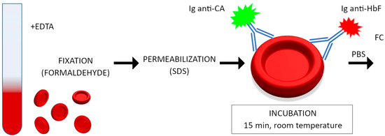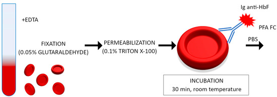 Blood samples containing 20 µL were fixed in cold (4 °C) freshly prepared 0.05% glutaraldehyde (Sigma-Aldrich, St Louis, MI, USA) for 10 min at room temperature. After being washed 3 times in PBS buffer, the cells were permeabilized with 500 µL 0.1% Triton X-100 (Sigma-Aldrich, USA) for 10 min at room temperature and washed with PBS again. Then, red blood cells were suspended in 300 µL PBS, and 10 µL RBC suspension was incubated for 30 min at room temperature (avoiding direct light) with 5 µL of PE-conjugated anti-HbF human monoclonal antibody (BD Pharmingen, Franklin Lakes, NJ, USA) and supplemented with 70 µL PBS with 0.1% BSA. After the final wash in PBS, the cells were resuspended in 300 µL of 1% paraformaldehyde (Sigma-Aldrich, USA) and immediately acquired by flow cytometer. Erythrocyte cell samples underwent FACS analysis using FACSCanto II and FACSDiva software v8.03 (Becton Dickinson, Franklin Lakes, NJ, USA). We calibrated the flow cytometer according to the manufacturer’s instruction. A total of 50,000 events were collected in samples. The cells were gated on log forward scatter (FS) versus log side scatter (SS) dot plots to exclude debris and agglutinated RBC, then gated on SSC versus FL2 dot plots to exclude autofluorescent granulocytes. Events were collected for fluorescence signal for PE conjugated to the anti-HbF antibody with the region gated at the erythrocytes. The following groups of erythrocytes were determined: adult erythrocytes (HbF-negative), adult F cells (HbF weakly positive) and fetal erythrocytes (HbF strongly positive). The procedure of fetal hemoglobin staining is presented in Figure 1 and an example of cytometric analysis is shown in Figure S1 (Supplementary Materials).