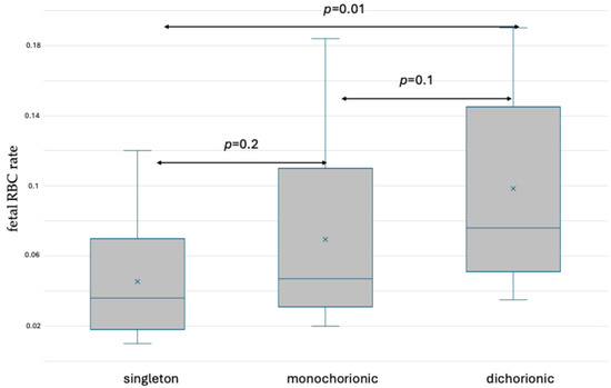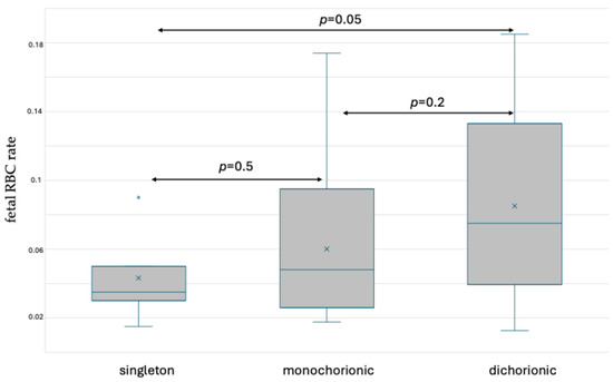 The rates of fetal red blood cells (RBCs) in the maternal circulation before delivery were assessed using the abovementioned methods. The values measured by performing fetal hemoglobin staining and fetal hemoglobin and carbonic anhydrase simultaneous staining are presented in Table S1 (Supplementary Materials). In HbF staining, no significant differences were observed in fetal RBC ratios between the group of singleton and monochorionic gestations, or between monochorionic and dichorionic gestations. In women with dichorionic pregnancy, more fetal RBCs were found in the circulation in comparison with singleton gestations (p = 0.05). The results are presented in Figure 3.