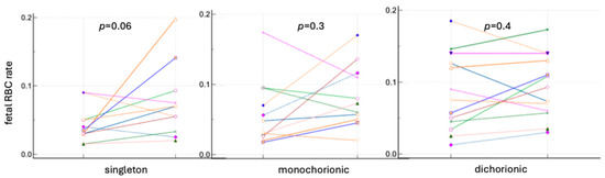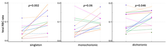 Fetal RBC ratios in singleton and twin pregnancy before and after delivery based on fetal hemoglobin staining. Lines present the fetal RBC rates before and after delivery in each patient.