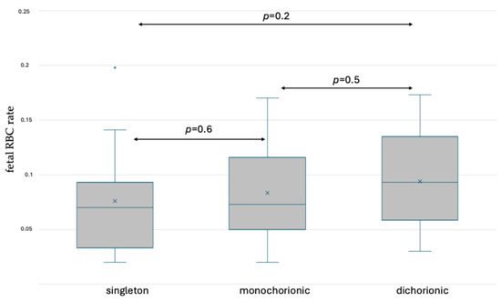 Box and whisker plots of fetal RBC ratios in singleton and twin pregnancy before delivery based on fetal hemoglobin staining. x—mean; blue line—median; blue circle—outliers.