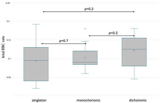 Box and whisker plots of fetal RBC ratios in singleton and twin pregnancy after delivery based on fetal hemoglobin staining. x—mean; blue line—median; blue circle—outliers.
