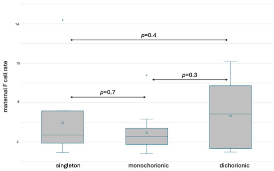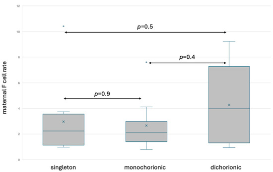Box and whisker plots of maternal F cell ratios in singleton and twin pregnancy based on fetal hemoglobin staining. x—mean; blue line—median; blue circle—outliers.