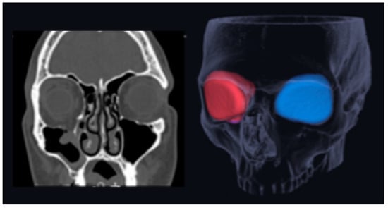 Orbital volume can be measured using either automated segmentation tools or by manually tracing and marking the orbital walls in each computed tomography (CT) slice. The marking of walls slice by slice has been a gold standard, but it is relatively time-consuming, and it is also possible that inter- and intra-observatory errors affect the reliability. In this study, orbital volume was measured through automated segmentation with the Bonelogic CMF Orbital programme (Disior, Ltd., Helsinki, Finland). This technique gauges orbital volume by converting the radiographic image to voxels, and thereafter, creates a three-dimensional interpretation of the bone structure with a method based on thresholds. Ultimately, the evaluator indicates the programme about the fractured orbit. The HU range for soft tissues is needed and can be manually adjusted if necessary. Otherwise, the segmentation happens without user interaction [27].