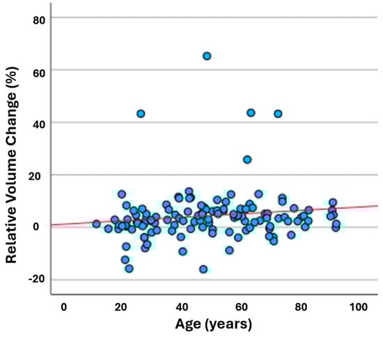 Relative volume change increased along with patient’s age. Each blue dot represents individual patient, and red line shows average relative (%) volume change compared to age.