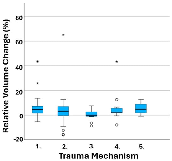 Relative volume change and trauma mechanism have no correlation. Blue box represents 50% of the patients and median; whiskers represent highest and lowest 25 percentages; stars and dots demonstrate the measurement outliers.