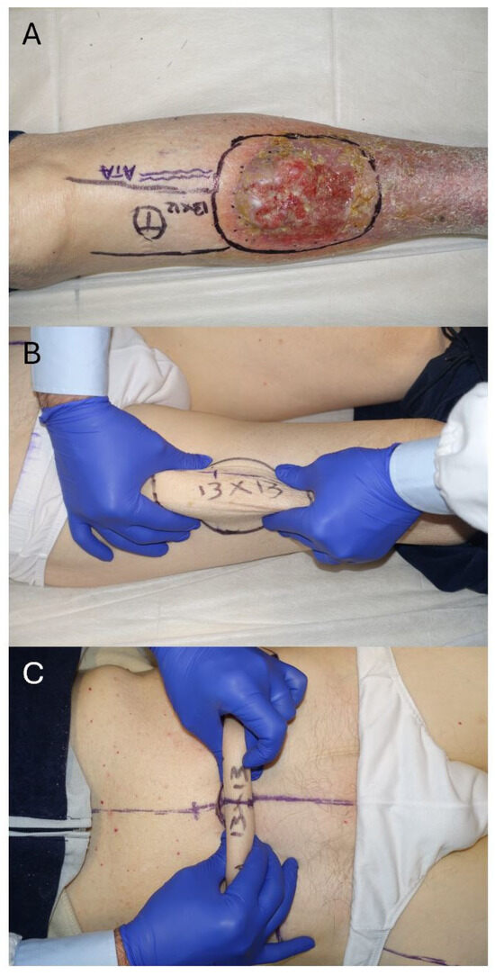 (A) Flap selection for a lower limb reconstruction with an extensive defect expected (13 × 13 cm). (B) A free ALT flap is one of the most common reconstructive options employed in sarcoma patients, but its donor site will require skin grafting for defects exceeding 8–9 cm in width. (C) The lower abdominal region (DIEP flap) allows the harvesting of larger flaps (10–17 cm in width) while achieving primary closure of the donor site in an aesthetic abdominoplasty fashion.