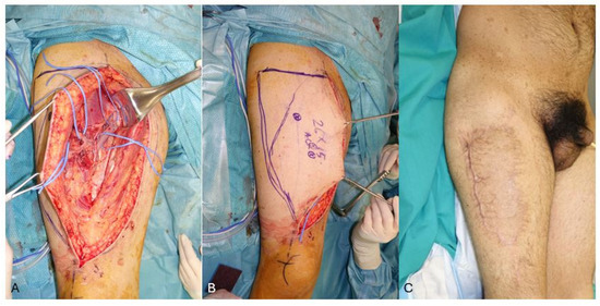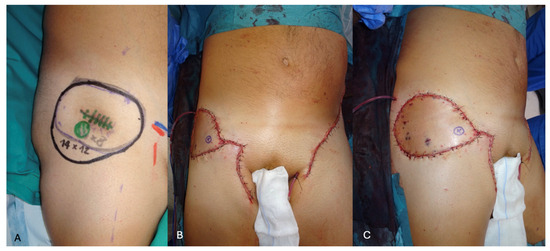 The body’s repertoire of viable flaps diminishes significantly when faced with the need for exceptionally large reconstructions. Among the array of available options to treat extensive defects, several significant approaches stand out. The most common solution employed is the latissimus dorsi flap, either muscular and covered with a skin graft or myocutaneous harvested as a “kiss” flap [5,6,7], which provides a reliable amount of tissue for coverage, albeit with limitations regarding donor site morbidity and aesthetic outcomes. Another workhorse to reconstruct medium to large-sized defects after sarcoma resection (Figure 1A) is the anterolateral thigh (ALT) flap, which, despite its widespread use, unfortunately, may entail higher morbidity at the donor site for flaps exceeding the possibility of primary closure (Figure 1B), eventually leading to less aesthetically pleasing outcomes.