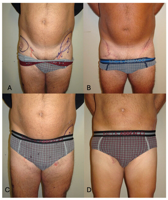 (A) Pre-operative frontal view with SCIP flap planning. (B) Six-month post-operative view showing a well-integrated flap allowing a like-for-like reconstruction with tissues of a similar color and texture from the contralateral side. The contour was restored, and the donor site was closed primarily in an aesthetic fashion. (C) Pre-operative frontal view with patient wearing underwear. (D) Six-month post-operative view with underwear, showing how the aesthetic approach employed allowed to us hide both the donor and recipient sites in well-concealed anatomical regions. The patient was very satisfied with the aesthetic result of the reconstruction.