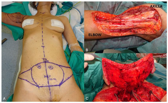 (A) a young female patient presented with an irradiated recurrent undifferentiated sarcoma involving the proximal right upper arm. The defect was almost completely circumferential, measuring 16 × 14 cm. The patient was scheduled for DIEP flap reconstruction, which was the only available donor site to allow primary closure in an aesthetically acceptable fashion in the supine operative position. (B) Intra-operative view of the extensive defect with exposure of the major neuro-vascular structures. (C) The patient was very thin and narrow waisted and the defect quite extensive. To safely cover the entire defect, all the lower abdominal tissue was required. Therefore, a bipedicled bilateral DIEP flap was harvested.