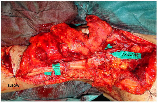 In our initial experience with sarcoma patients, we addressed such complex defects with workhorse flaps such as the ALT flap [11], because of its relatively constant anatomy, reliable vascularization, long vascular pedicle, and extreme variability in design due to the abundance of perforators and possibility to vary the flap thickness according to the defect. This flap can be raised as a thin flap, which is useful for the reconstruction of regions in which the restoration of the normal range of motion is paramount, like the axilla (Figure 2) or the foot [12], or, in cases where the is a need to fill a deep dead space. Moreover, as recently described [13], the ALT flap skin island can be combined with the harvest of the vastus lateralis or rectus femoris muscles to provide functional reconstruction in cases of quadriceps or calf compartments resections [14]. Generally, the maximum width for primary closure of the ALT donor site is 8 to 10 cm [15,16], which is achievable only in cases of significant skin laxity.