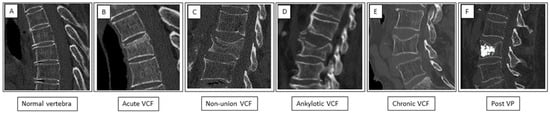 Patterns of vertebrae appearance on sagittal spine CT. (A) Normal vertebra—retained height and continuous cortex. (B) Acute VCF showing a “step defect” in the anterior border and a “zone of impaction” caused by impaction of the trabeculae. (C) Non-union fracture—a non-healed fracture with an intervertebral cleft (white arrow). (D) Ankylotic fracture—a transverse fracture below an ankylotic spine segment. (E) Chronic fracture showing loss of height and smooth cortical borders. (F) State after percutaneous vertebroplasty (Post VP)—chronic fracture with loss of height and hyperdense cement in the vertebral body.