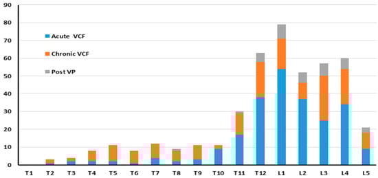 The present study identified and characterized 2966 vertebrae in 190 patients with 439 VCFs. The study population was mostly elderly and female. Only 5% of the patients had normal bone density, estimated using spine CT, and over 85% had osteoporosis according to these measurements. Most patients (55.8%) had more than one VCF, with 16.8% of them having three or more VCFs. In some cases, a combination of acute and chronic fractures was found. Most of the fractures were located in the thoraco-lumbar area.