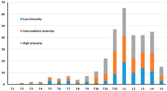 In BS, increased uptake, consistent with a vertebral fracture, was observed in 323 vertebrae. The uptake intensity was low in 81 (25%) vertebrae, intermediate in 107 (33%), and high in 135 (42%) vertebrae. Most of the vertebrae with an abnormal uptake were seen in the thoraco-lumbar region (Figure 3).