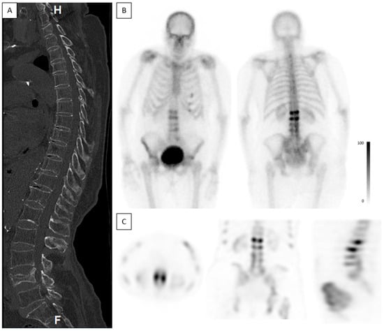 - Ap Dafydd, D.; Salem, S.; Zerizer, I.; Yan Mok, W.; Gishen, P.; Patel, M.C.; Patel, N.H.; Al-Nahhas, A.; Dunn, J.; Win, Z. The value of combined assessment of vertebral fractures with 99mTc MDP scintigraphy and MRI in selecting and planning percutaneous vertebroplasty. Nucl. Med. Commun. 2014, 35, 755–761. [Google Scholar] [CrossRef] [PubMed]