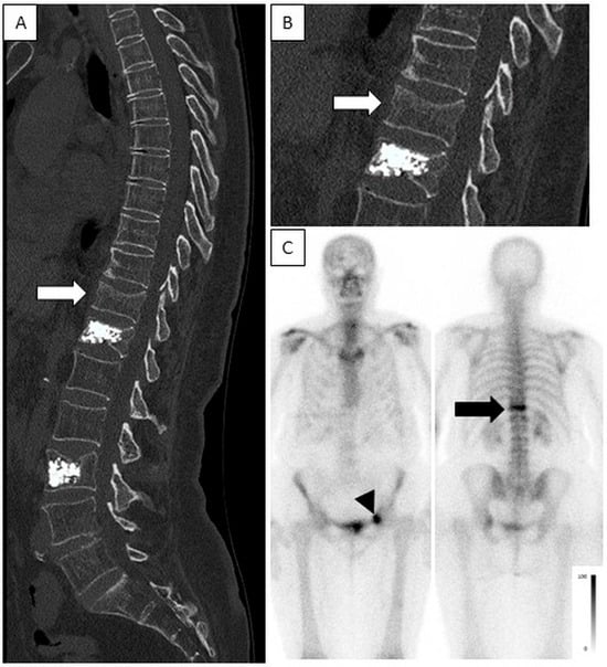 - Jordan, E.; Choe, D.; Miller, T.; Chamarthy, M.; Brook, A.; Freeman, L.M. Utility of Bone Scintigraphy to Determine the Appropriate Vertebral Augmentation Levels. Clin. Nucl. Med. 2010, 35, 687–691. [Google Scholar] [CrossRef] [PubMed]