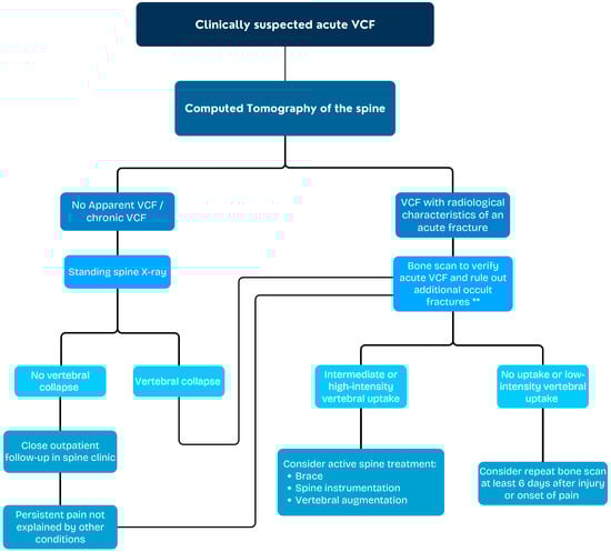 VCF diagnostic flow-chart. When MRI is unavailable or contraindicated. ** Bone scan should be obtained at least 48 h after injury or onset of pain.