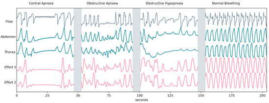 During the overnight studies, RIP bands were used to derive a gold standard measure of respiratory effort in the context of OSA. The tests were scored according to the AASM criteria by a team of clinicians shown in Table 1 [23]. Figure 1 shows the acoustic effort channels alongside the RIP-extracted effort during different abnormal respiratory events.