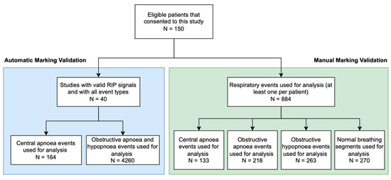 The acoustic effort channels were also blindly marked by an RPSGT certified physiologist during a manual marking trial. The scorer assessed 884 randomly presented individual events. Those events had previously been labelled by an expert clinician scorer who had marked them in the context of the study reported in [21] as central apnoeas (133), obstructive apnoeas (218), obstructive hypopnoeas (263), and normal breathing segments (270). In order to avoid bias in the results, the scorer for this study was also blinded to these values. The scorer was provided with two effort channels, a nasal flow channel, and an SpO2 channel in order to correctly be able to identify the different event types. Figure 2 shows a summary of the data flow used for this validation analysis.