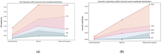 The average amplitudes for each event were calculated and separated per event type. This was carried out to compare the differences between the amplitude distributions within channels by studying the amplitude overlap that exists between different event types for both effort channels. Although absolute values of amplitude are not important, relative differences and non-overlap help to differentiate events visually. Figure 3 displays the distribution of these amplitudes in five different centiles for the acoustics effort channel and the RIP effort channel. It can be seen how in the case of RIP there is a less clear separation in amplitude between different types of events.