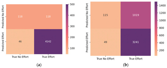 Confusion matrices for the effort channel from acoustics (a) and the RIP effort channel (b).