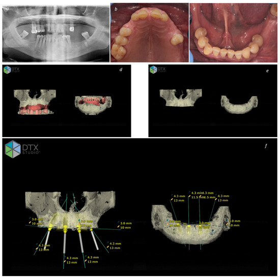 Planning a full-arch bimaxillary rehabilitation through the All-on-4 Concept: (a) Pre-treatment orthopantomography; (b) Pre-treatment intraoral photograph of the maxilla; (c) pre-treatment intraoral photograph of the mandible; (d) DTX Studio image exhibiting the pre-treatment condition in the maxilla and mandible with superimposition of CBCT and Intraoral Scanner (smart fusion); (e) DTX Studio image of the planning exhibiting the bone regularization to achieve a stable platform for implant insertion in the maxilla and mandible; (f) DTX Studio image of the final planning exhibiting the implant planning (diameter and length) in the maxilla and mandible.