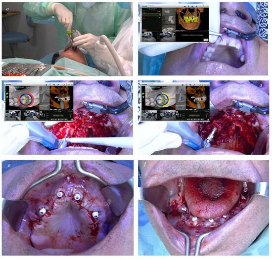 Peroperative bimaxillary full-arch rehabilitation through the All-on-4 Concept with implant insertion assisted by navigated surgery: (a) Connection of the X-Guide clip receptor and array; (b) Superimposition of the implant planning (performed in DTX Studio Implant Software) with the patient’s jaw was achieved through the selection of points in three teeth on the software (virtual) matched with a calibration probe on the real patient’s teeth at the same points (X-Mark); (c) 2 mm twist-drill during osteotomy for insertion of implant in position 15 (tilted implant); (d) Insertion of implant 15 (note the live feedback provided by the navigation in degrees and depth); (e) Intraoral photograph after implant insertion and abutment connection in the maxilla; (f) Intraoral photograph after implant insertion and abutment connection in the mandible.