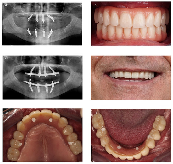 Prosthetic restoration of the bimaxillary full-arch rehabilitation: (a) Post-operative orthopantomography immediately after surgery; (b) Intraoral frontal photograph with the immediate provisional prostheses; (c) Final orthopantomography at 2 years of follow-up with the definitive prostheses (Maló Clinic Acrylic Bridge—titanium infrastructure, acrylic artificial gingiva and acrylic crowns); (d) Patient smiling with the definitive prostheses in place at 2 years of follow-up; (e) Intraoral occlusal view of the maxillary definitive prostheses at 2 years of follow-up; (f) Intraoral occlusal view of the mandibular definitive prostheses at 2 years of follow-up.