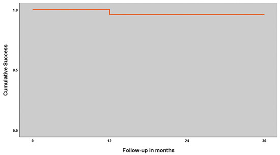 No patients were lost to follow-up. Two implants were lost in one female patient with aged 55 years with smoking habits: both implants presented mobility (implant in position 15 after 7 months, and implant in position 25 after 9 months of follow-up). Both implants were removed, resulting in an implant cumulative survival rate of 95.8% with a follow-up of up to 3 years (Table 1; Figure 4). The failed implants were replaced by a standard implant (position 15) on the same day as implant failure and a zygomatic implant (position 25) four months after the failure. The prosthesis remained in function supported on the remaining implants throughout the replacement of the failed implants (the prosthesis was sectioned at position 25 when the implant was lost). The replacement implants were not accounted for in this study.