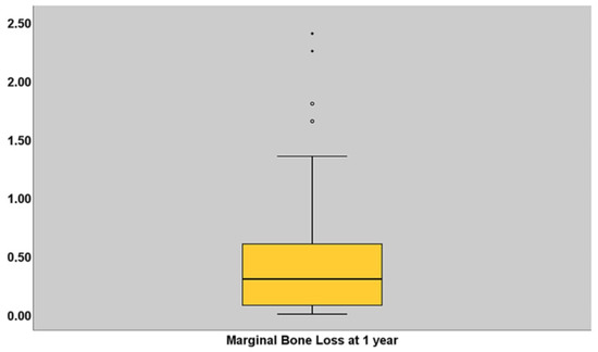 Boxplot illustrating the marginal bone loss measured in millimeters at 1 year of follow-up. The median is represented by the horizontal black line inside the box; the lower box edge represents the 25th percentile; the upper box edge represents the 75th percentile; whiskers represent the standard deviation; dots represent outlier values.