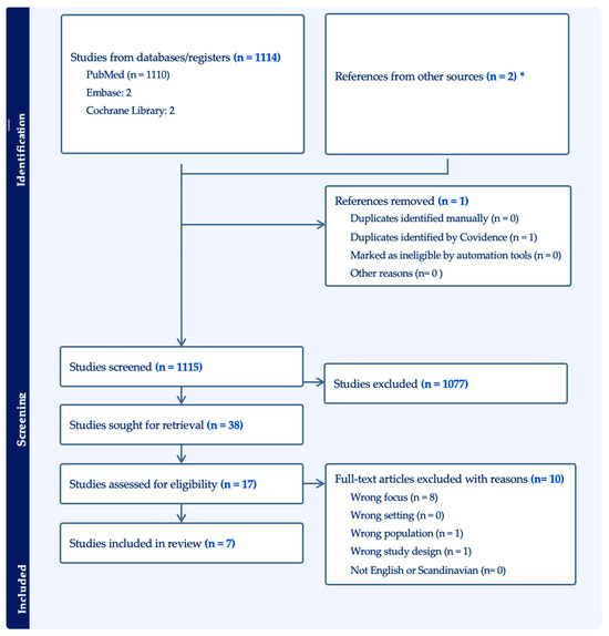 The study selection process is presented in the PRISMA flowchart diagram (Figure 1). We obtained 1114 articles after the initial search string on PubMed, Cochrane Library, and Embase, with an additional 2 papers obtained through expert knowledge. Only 1 duplicated article was removed, 1115 articles were screened by title and abstract, and we excluded 1077 articles. This resulted in 38 articles that underwent full screening and 10 articles that were not included in the screening due to missing eligibility criteria. The total number of articles that were included in the following review is seven.