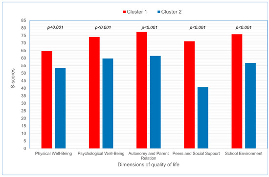 Two clusters of adolescents with HM were generated based on the scores on five dimensions: Physical Well-Being, Psychological Well-Being, Autonomy and Parent Relation, Peers and Social Support, and School Environment. The first cluster included adolescents who reported higher S-scores on these dimensions, and the second included adolescents who reported lower scores on these dimensions.