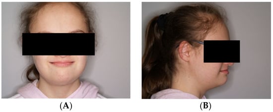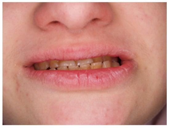 In December 2023, a 13-year-old girl with Down syndrome visited a dentist for treatment of temporomandibular joint disorders and symptoms of worn teeth. According to the patient’s medical history, she was being treated for hypothyroidism by an endocrinologist and was permanently taking Euthyrox (Levothyroxine) at a dose of 75 mg/day. Due to the difficulty in self-assessing the girl’s symptoms, all information was obtained from the child’s parents. From an interview with the patient’s mother, in the years 2018–2020, the patient was treated by a psychiatrist for anxiety, and during this period, she took Seronil (Fluoxetin) at a dose of 10 mg ¼ tablet once per day. Moreover, the child was healthy and did not complain of other health problems. Regarding the social area, the child studied in a school for special educational needs and disabled children. She established and maintained contact with peers, communicated verbally, expressed her needs, shared comments, and conducted alternating dialogs.