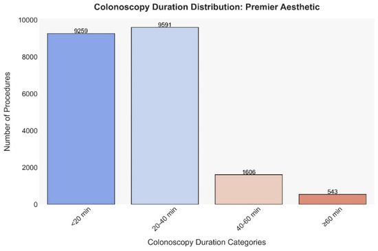 The graph in Figure 1 illustrates the frequency of colonoscopies across different duration categories. The majority of procedures fall within the shorter durations, with 9259 colonoscopies (48.9%) completed in less than 20 min and 9591 (50.7%) within 20 to 40 min. There is a notable decrease in frequency as the duration increases, with 1606 procedures (8.5%) lasting between 40 and 60 min and only 543 (2.9%) extending beyond 60 min.