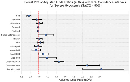 The logistic regression analysis demonstrated significant predictors of hypoxemia during colonoscopy. Age and colonoscopy duration were notable factors. Patients aged 60–80 and ≥80 had increased odds of hypoxemia, with adjusted odds ratios (aOR) of 1.1 (95% CI 1.0–1.2) and 1.2 (95% CI 1.0–1.4), respectively. Duration of the procedure emerged as a strong predictor: durations of 20–40 min, 40–60 min, and over 60 min were associated with progressively higher odds of hypoxemia, with aORs of 1.5 (95% CI 1.4–1.6), 2.1 (95% CI 1.9–2.4), and 2.4 (95% CI 2.0–3.0), respectively. Other variables, such as sex, elective procedure status, and medication dosages (midazolam, propofol, fentanyl), had less pronounced effects. The forest plot in Figure 2 visually represents the aORs and their respective confidence intervals, reinforcing the relationship between increased colonoscopy duration and the risk of severe hypoxemia.