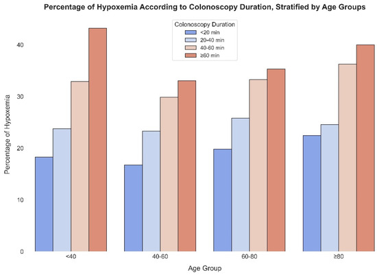 Figure 3 displays the percentage of severe hypoxemia events across different colonoscopy durations stratified by age groups. For the youngest cohort (<40), hypoxemia rates rise from 18.3% for procedures under 20 min to 43.2% for those over 60 min. This increasing trend persists across all age categories, with the 40–60 age group experiencing hypoxemia rates from 16.7% to 33.1%, the 60–80 age group from 19.8% to 35.3%, and the oldest group (≥80) from 22.5% to a significant 40.0% for the longest durations. These percentages emphasize the heightened risk of severe hypoxemia with longer colonoscopy procedures across all age groups.