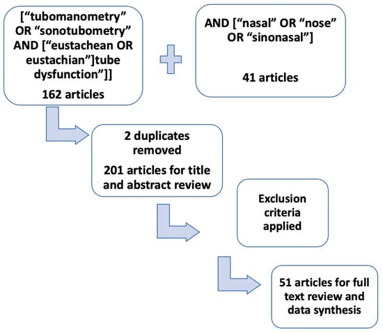 A comprehensive review of the literature was performed through the Ovid research tool in the Pubmed/Medline library using the following search terms: [“tubomanometry” OR “sonotubometry” AND [“eustachean OR eustachian”] tube dysfunction”] with an add on search AND [“nasal” OR “nose” OR “sinonasal”]. A separate search in the NICE guidelines was performed to investigate further regarding recent diagnostic guidelines. The first search revealed 162 articles that discuss the diagnostics of ETD, including tympanometry, sonotubometry and tubomanometry. The second search revealed 41 articles, and there was an overlap of 2 articles between the two searches. The titles and abstracts of all 201 articles were assessed. Articles mentioning tubomanometry or sonotubometry only as an investigation before a procedure such as grommets insertion or balloon dilation, not going into detail regarding diagnosis of ETD, were excluded from full text review. Also, articles discussing tubomanometry or sonotubometry diagnostic value for other relevant diseases such as chronic middle ear disease without mentioning ETD were also excluded from the full text review. The literature review focused on case series and prospective and retrospective studies, as well as systematic reviews that included diagnostic approaches for ETD. The research methods and inclusion criteria can be found in Table 1 and Figure 1. A full text review was performed on 51 articles. The data extracted from 51 articles are shown in Table 2. Table 3 shows the relevant literature review results. This article discusses diagnostic methods of ETD mentioned in the literature and considers the strengths and weaknesses of each one of them, always with relevance to nasal disease.