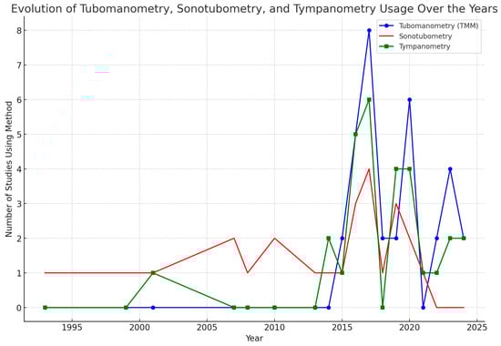 In addition, TMM, sonotubometry and tympanometry are mentioned as sole methods or as a combination of investigations in all articles. More specifically, tympanometry is mentioned in 42% of the articles, TMM in 56% and sonotubometry in 47% (Table 2). Please also see the chart in Figure 2. All the articles discuss the diagnostic approaches and mention the lack of a consensus on ETD diagnosis. It is interesting that more recent articles mention TMM much more frequently, while sonotubometry is mostly used in articles before 2010. This might reflect a shift by researchers towards TMM to diagnose ETD, moving away from sonotubometry.