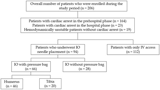 In this study, 206 patients were analyzed, including 94 and 112 in whom IO and IV access was established, respectively. In the IO group, 24 received IO access only, and 70 received both IO and IV access.