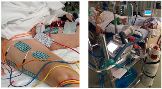 - Segers, J.; Hermans, G.; Bruyninckx, F.; Meyfroidt, G.; Langer, D.; Gosselink, R. Feasibility of neuromuscular electrical stimulation in critically ill patients. J. Crit. Care 2014, 29, 1082–1088. [Google Scholar] [CrossRef]