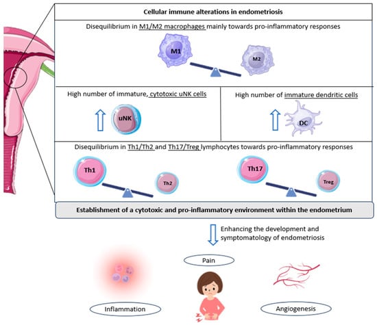 Cellular immunological alterations and associated symptomatology in patients with endometriosis. The underlined text indicates the cell populations altered in endometriosis; in other words, the imbalance of M1/M2 macrophages, Th1/Th2 lymphocytes, and Th17/Tregs reported in patients with endometriosis, along with the observed increase in other immune cell populations, such as cytotoxic NK cells and immature dendritic cells. All these cellular alterations favor the development and associated symptomatology of endometriosis, including inflammation, pelvic pain, and angiogenesis, further promoting endometriotic lesions. DC: dendritic cell; Th: T helper cell; Treg: regulatory T cell; uNK: uterine natural killer cell. Original, created with Biorender.com and SMART.servier.com (accessed on 22 May 2024).