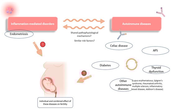 This situation of immune over-activation and chronic pro-inflammation is, as already discussed, a common feature of autoimmune disorders that, per se, has a negative impact on reproduction. Moreover, a link appears to exist between the development of CD and other autoimmune disorders, pointing to the altered systemic immune behavior in these women (Figure 4). For example, shared pathogenic mechanisms have been described for CD and type 1 diabetes, both conditions being linked to closely related high-risk human lymphocyte antigens (HLA-DR-DQ) [128].