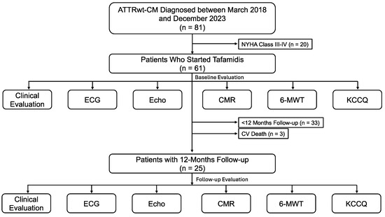To be eligible for enrollment, patients had to meet the following inclusion criteria: diagnosis of ATTRwt-CM; therapy with tafamidis 61 mg once daily for 12 months; and complete clinical, biochemical, functional, and imaging assessment at baseline and follow-up evaluations. Patients diagnosed with ATTRh-CM and those without complete serial evaluations during follow-up were excluded.