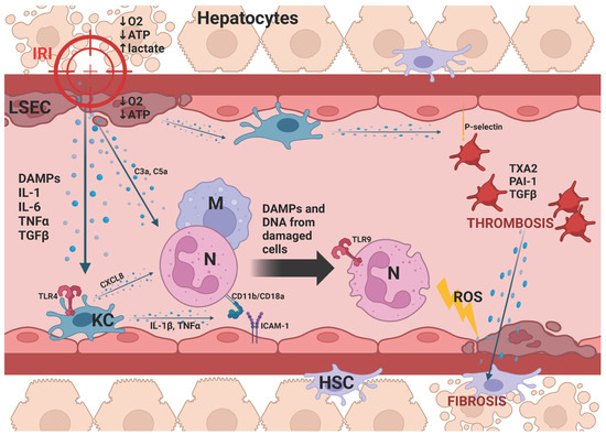 Termination of the initial blood supply decreases the amount of oxygen received by hepatocytes and liver sinusoidal endothelial cells (LSECs), leading to mitochondrial damage, ATP depletion, and increased lactate accumulation [8]. This results in IRI-induced hepatocyte and LSEC death accompanied by the release of inflammatory cytokines (IL-1β, IL-6, TNFα, TGFβ), damage-associated molecular patterns (DAMPs), and DNA fragments. Resident liver macrophages (Kupffer cells) stimulated by these factors increase toll-like receptor (TLR) expression and initiate chemokine 8 (CXCL8) secretion, which binds to complement proteins (C3a and C5a) derived from damaged LSECs and hepatocytes, and induces the migration of neutrophils to the liver as the organ reperfuses [9,10]. Kupffer cells also release IL-1β and TNFα, which promote adhesion between neutrophils (CD11b/CD18a) and LSECs (ICAM-1) [11]. The further neutrophil degranulation and reactive oxygen species (ROS) secretion, stimulated mainly by DAMPs and DNA from the damaged cells, exacerbate the destruction of liver tissue [12]. At the same time, increased P-selectin expression on the surface of the epithelium activates platelets, which release thromboxane 2A (TXA2), plasminogen activator inhibitor-1 (PAI-1), and TGFβ, leading to thrombosis and HSC-dependent graft fibrosis [13,14]. Figure 1 depicts the cellular mechanism behind the liver IRI.