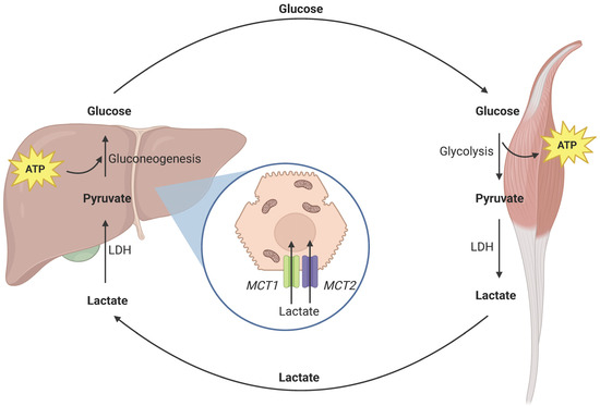 Illustration of the lactic acid cycle (Cori cycle). Lactates, produced mainly in the muscles, cannot be efficiently metabolized in the liver due to ischemia–reperfusion injury (IRI) and the lack of ATP in hepatocyte mitochondria. Hyperlactatemia is exacerbated by the failure of MCT1 and MCT2 membrane transporters, leading to dysfunctional lactate uptake by the hepatocyte. Abbreviations: adenosine triphosphate (ATP), lactate dehydrogenase (LDH), monocarboxylate transporter (MCT1, MCT2). Created with BioRender.com (accessed on 26 May 2024).