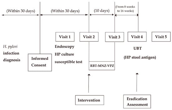 This single-center, open-label, single-arm intervention study was designed to assess a 10-day course of triple therapy with RBT, MNZ, and VPZ (RBT-MNZ-VPZ therapy). The research was carried out in compliance with Japan’s Clinical Trial Act and the Declaration of Helsinki and was conducted at Yokohama City University Hospital. The study protocol was reviewed and approved by the Yokohama City University Certified Institutional Review Board (CRB No. CRB3180007) on 1 December 2022 (Approval No. CRB22-004). This study was registered in the Japan Registry of Clinical Trials (jRCT) on 9 December 2022 (identifier jRCT031220504), as mandated by the government of Japan in its 2019 Clinical Trials Act. All study participants provided informed written consent prior to study enrollment.