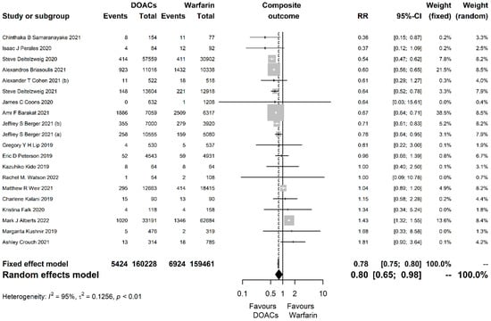 For the primary composite outcome, 20 studies including 319,689 participants were analyzed with DOACs being associated with significantly greater risk reduction compared to warfarin (RR = 0.80, 95% CI [0.65, 0.98], P = 0.033; I2 = 95%, p < 0.001; Figure 1).